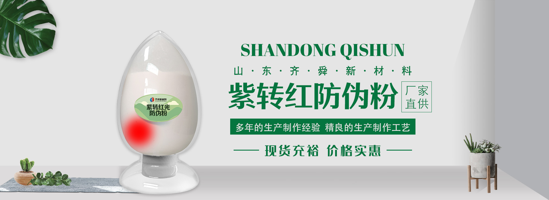 我公司前身為2011年成立的淄博舜明熒光科技有限公司。隨著公司的發(fā)展,廠址從淄博搬遷到青島,2020年5月公司重新注冊為山東齊舜新材料有限公司。公司注冊資本2000萬元,主要從事新材料研究和開發(fā)。目前主要產(chǎn)品包括:農(nóng)膜用轉(zhuǎn)光粉、轉(zhuǎn)光母粒以及轉(zhuǎn)光農(nóng)膜;農(nóng)膜用長效防霧流滴涂覆液;復(fù)合肥添加劑及葉面肥(稀土微肥);防偽粉;LED封裝熒光粉;夜光粉;太陽能光伏電池增效熒光粉;鋰電池正極材料等。